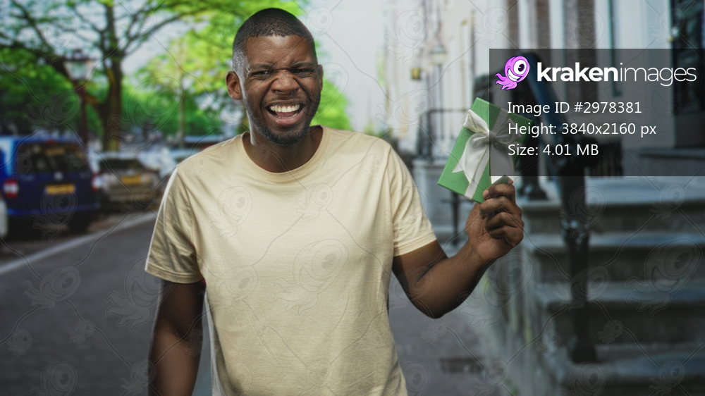 Man holding green gift box with white bow, smiling and looking at the present while standing on a city street beside brownstone steps and parked cars; joy celebration gratitude. - Kraken Images