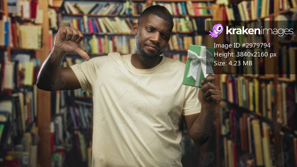 Man holding green gift box with white ribbon while giving thumbs down and frowning amid bookshelves in a building; disapproval rejection.