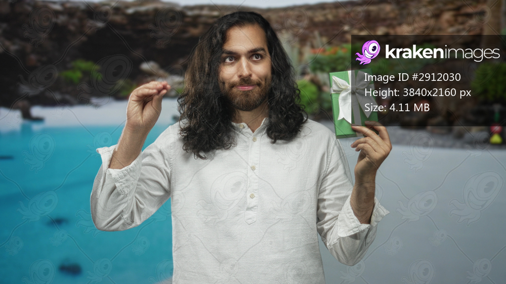 Man holding green gift with raised hand by pool outdoors near turquoise water, wearing white shirt and beard, looking upward; playful surprise.