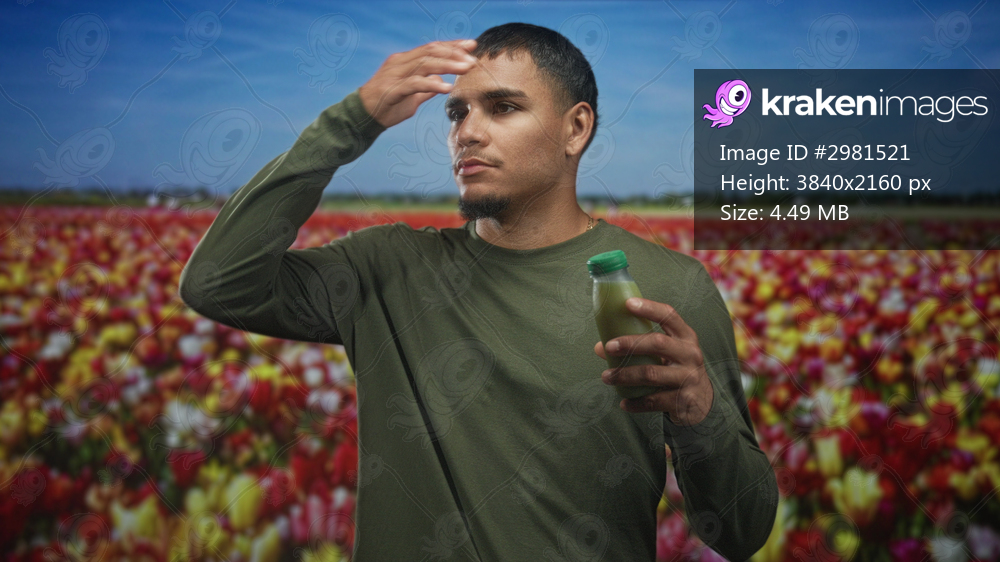 Man holding green juice bottle with hand in studio tulip field, gaze forward and slight raised hand gesture; wellness contemplative.
