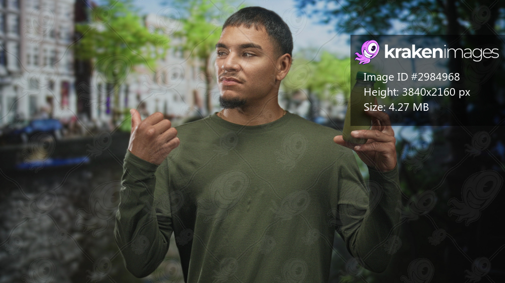 Man holding green juice bottle in right hand with left thumb up gesture on a street by a canal; wellness confidence.
