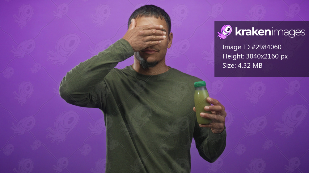 Man holding green juice bottle, smiling while one hand covers his eyes, wearing olive long sleeve shirt against purple studio backdrop; playful wellness. - Kraken Images