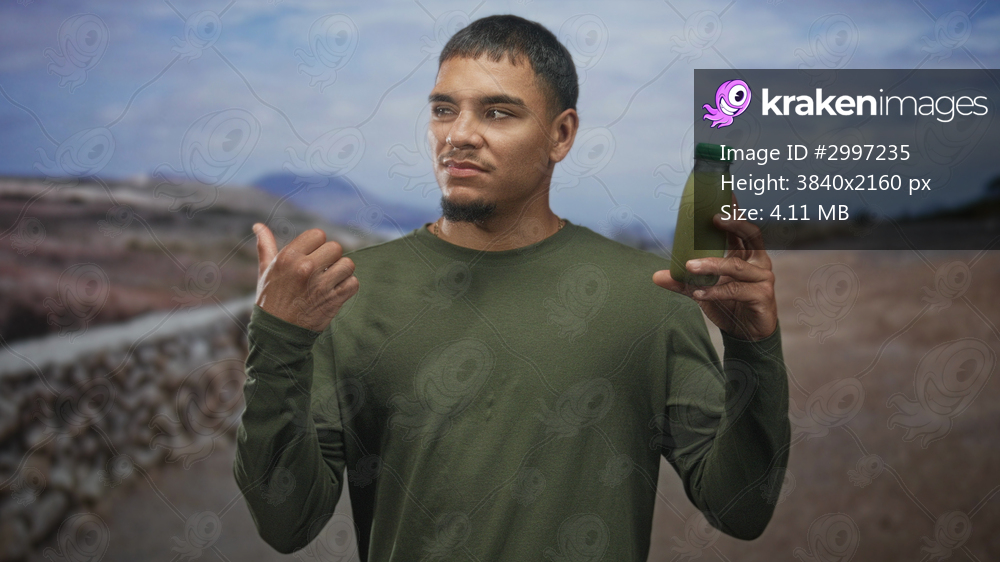 Man holding green juice bottle with thumb pointing to bottle, wearing olive shirt against landscape backdrop in studio; wellness confident.