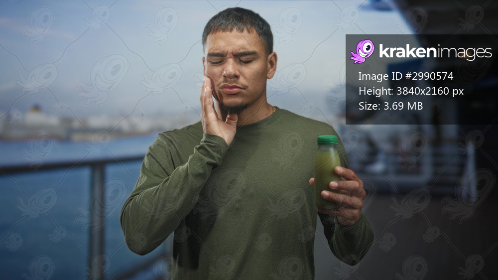 Man holding green juice bottle touches cheek with closed eyes on street pier near water and railing; disgust.