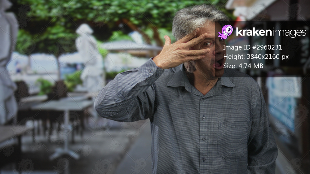 Man holding hand over eye on street cafe walkway, mouth open in surprised grimace; surprise curiosity.