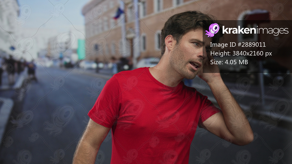 Man holding hand to ear on a busy city street wearing red t shirt and listening to distant noise; curiosity attention.