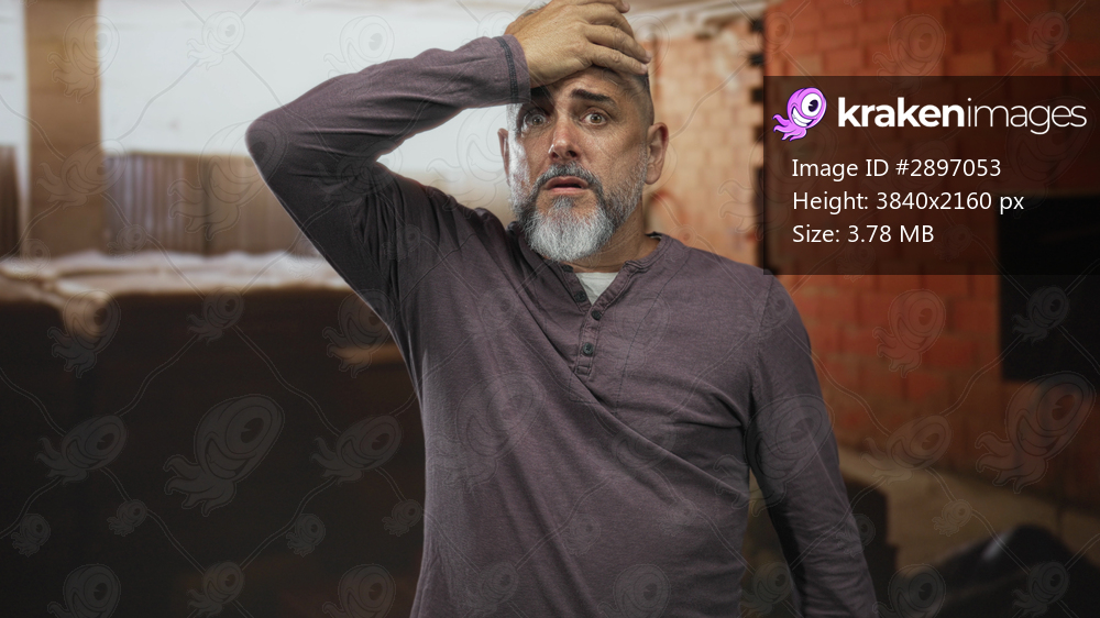 Man holding hand to forehead with a startled expression, visible hand and beard, standing beside a brick wall inside a building site; surprise work hazard. - Kraken Images