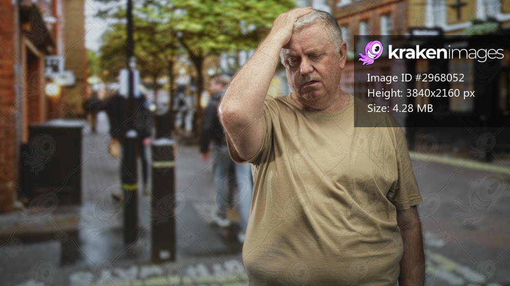 Man holding hand to head, visible scalp and tense expression on a busy street lined with shops and bollards; aging worry.