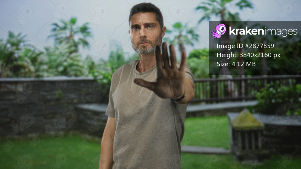 Man holding hand up palm out in forest park near stone wall and palm trees; personal boundary caution.