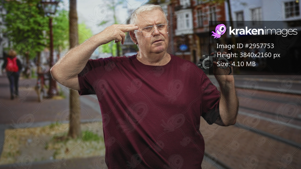 Man holding handheld phoropter and pointing finger to temple on a busy street during an eyeglass vision examination with visible trial frame; skepticism. - Kraken Images