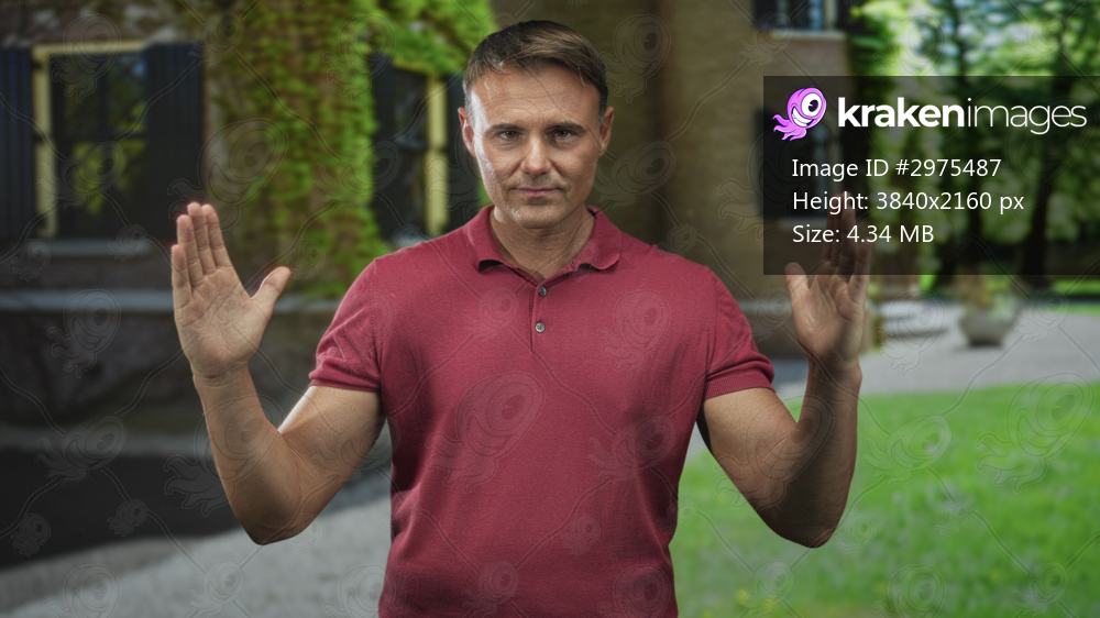 Man holding hands apart with palms out beside an ivy covered building and gravel courtyard, wearing red polo shirt and attentive expression; confidence composure. - Kraken Images