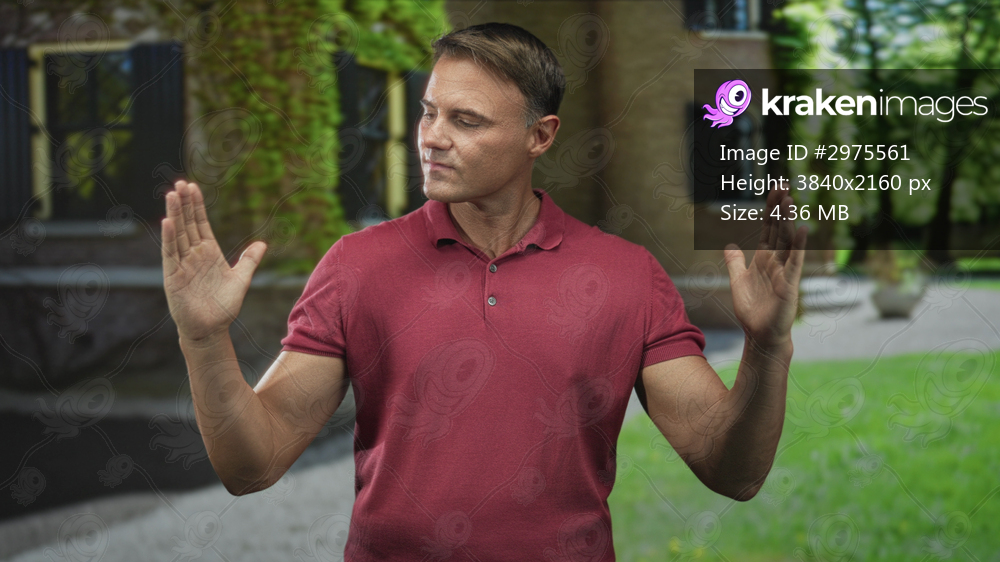 Man holding hands apart with palms out beside an ivy covered building and gravel courtyard, wearing red polo shirt and attentive expression; confidence composure. - Kraken Images
