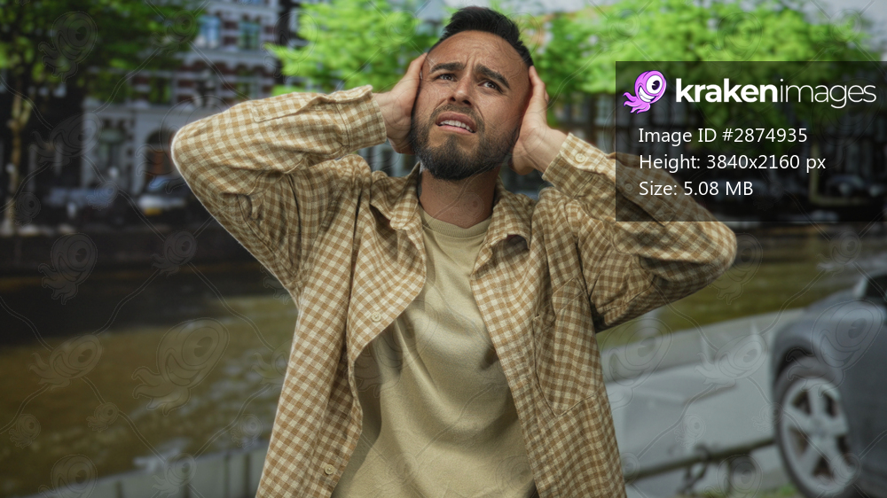 Man holding hands to ears by a canal on a street in amsterdam, expressing discomfort; urban noise distress.