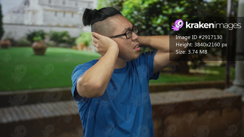 Man holding hands to ears in building courtyard wearing blue shirt and glasses; annoyance sensory overload.