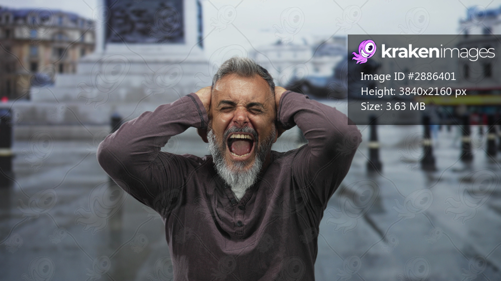 Man holding hands to ears and screaming in street plaza beside stone monument and lion, gray beard visible; frustration release.