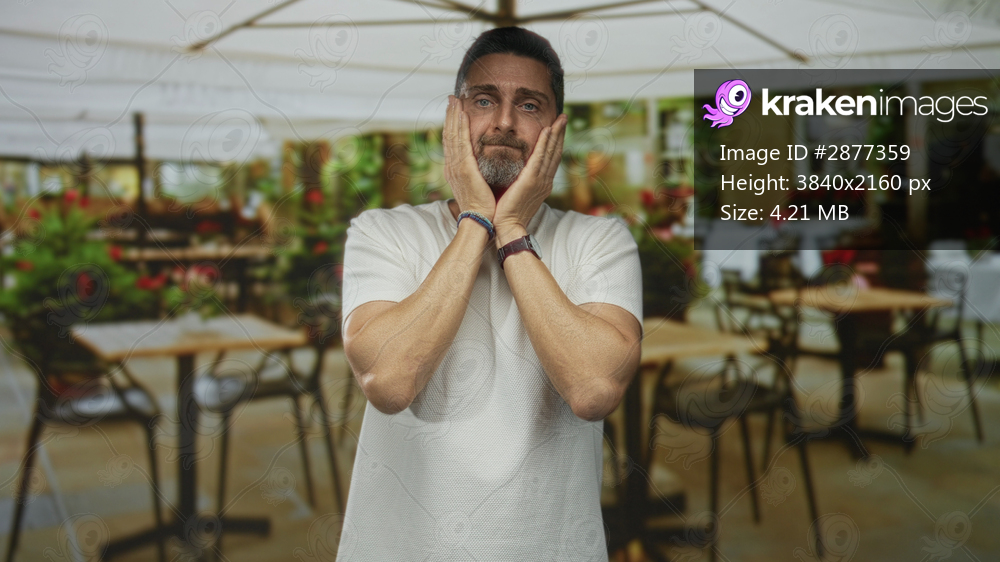 Man holding hands to head covering ears at a street cafe terrace outdoors wearing white t shirt and bracelets; stress and frustration.