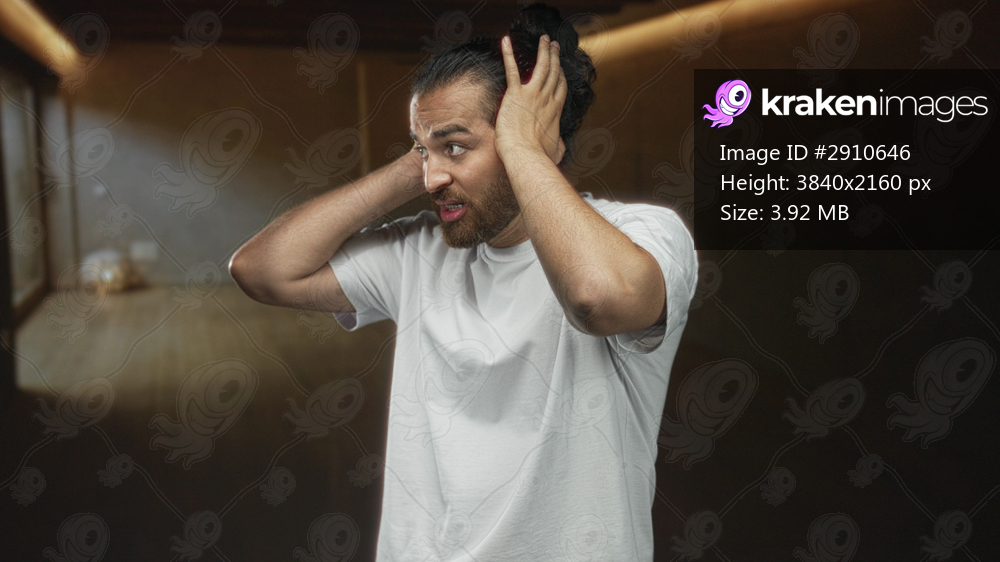 Man holding hands to head covering ears in a studio room wearing white tshirt and beard bun; anxiety isolation overwhelm.