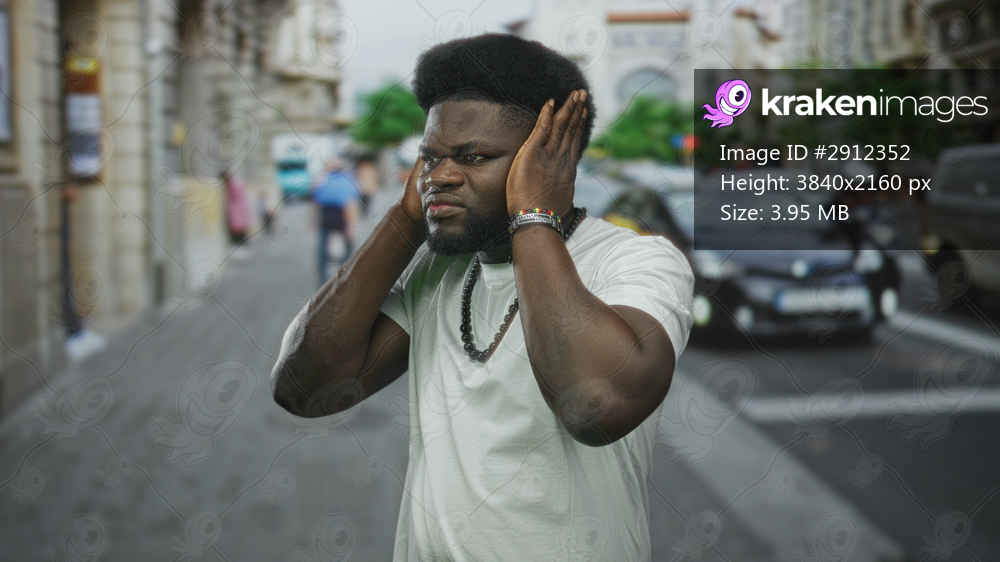 Man holding hands to his ears on a busy city street with parked cars and blurred pedestrians; sensory overload annoyance.