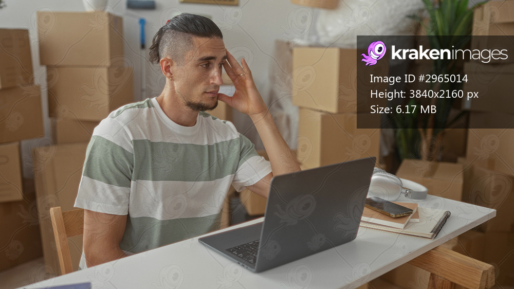 Man holding head with hands at laptop amid packed moving boxes in building; stress fatigue frustration.
