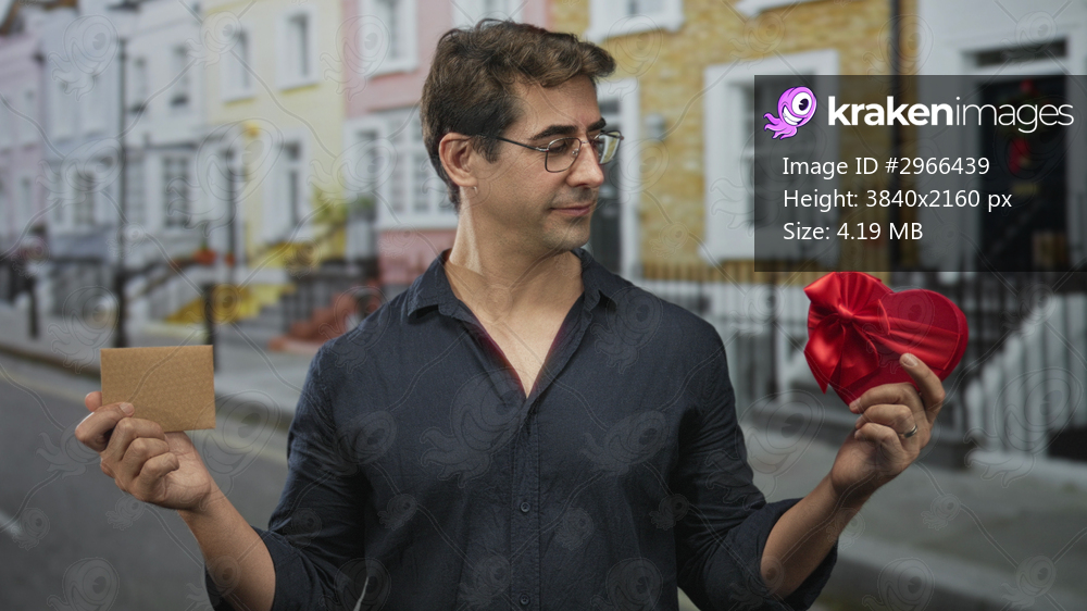 Man holding heart shaped gift box and small envelope with hands extended on a street; romance hesitation.