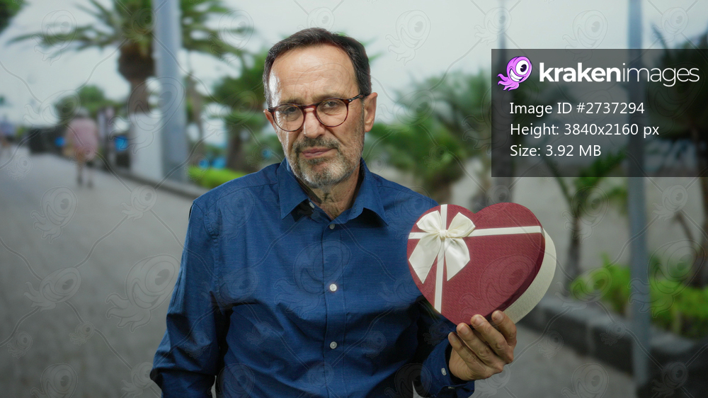 Man holding heart-shaped gift in outdoor urban park with blurred background and palm trees suggesting warmth and affection.
