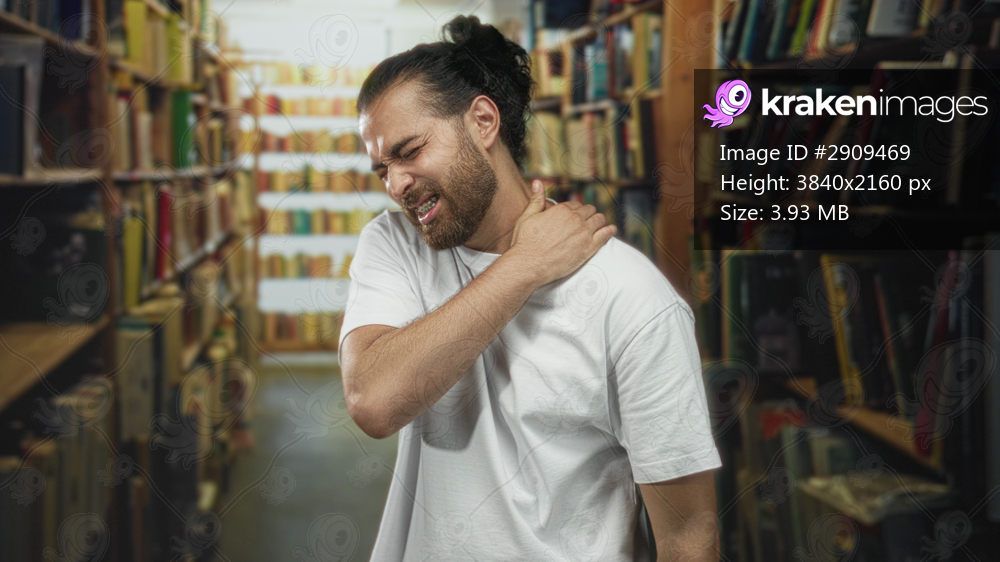 Man holding his neck with one hand among library shelves, grimacing with closed eyes and braced shoulder; pain.