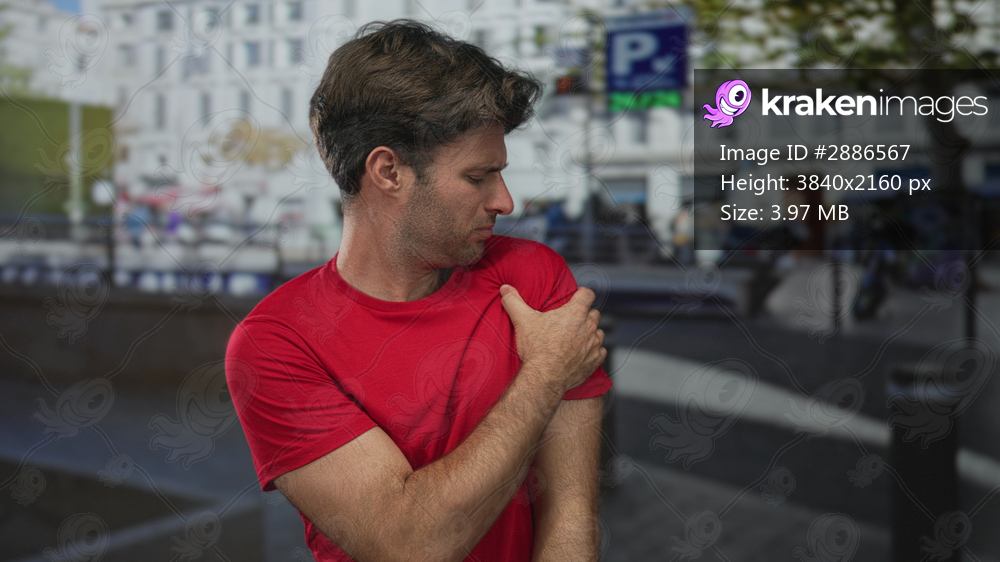 Man holding his shoulder and wincing on a city street in a red t shirt, hand pressed to shoulder for shoulderache; pain.