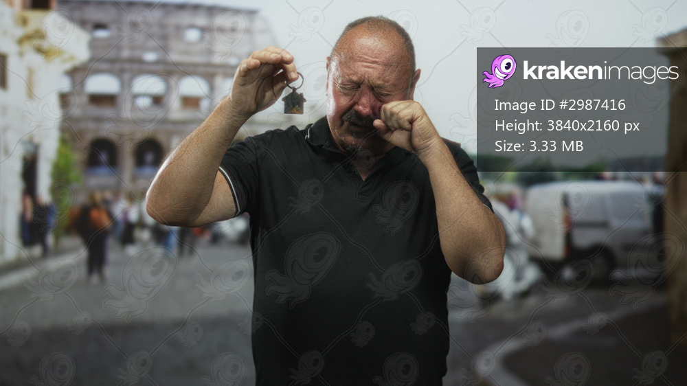 Man holding house keys while rubbing his eye and crying on a historic street by the colosseum; loss grief.