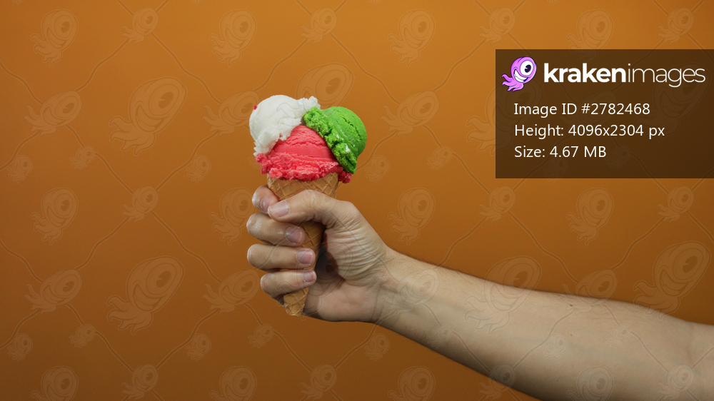 Man holding ice cream cone against isolated orange wall, showcasing colorful scoops in a vibrant display with a caucasian male hand grasping the dessert prominently. - Kraken Images