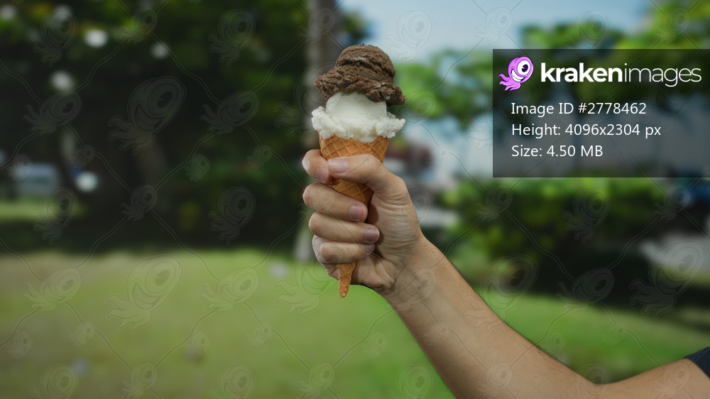 Man holding ice cream cone with chocolate and vanilla outdoors in park on sunny day surrounded by green trees enjoying summer treat with hand visible foreground - Kraken Images