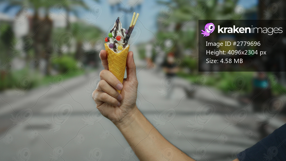 Man holding ice cream cone in hand with colorful toppings on a sunny day in a city street lined with palm trees.
