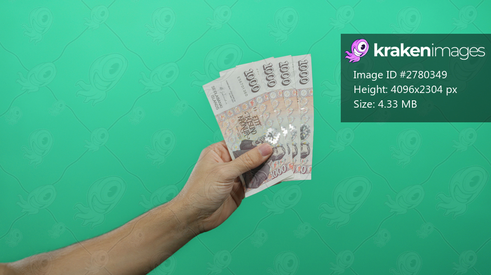 Man holding icelandic krona banknotes against a green background shows financial success and currency concepts in an isolated setting.