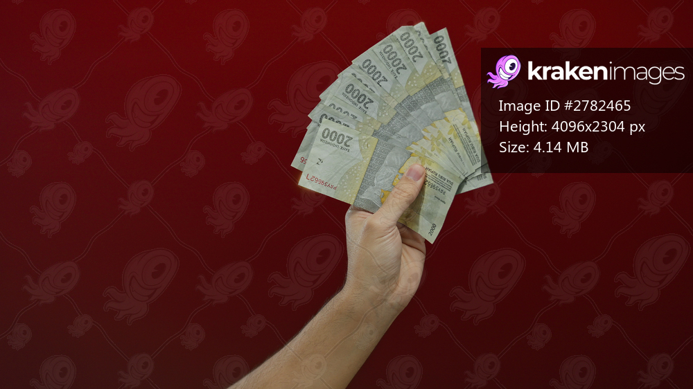 Man holding indonesian rupiah banknotes against a vibrant red background.