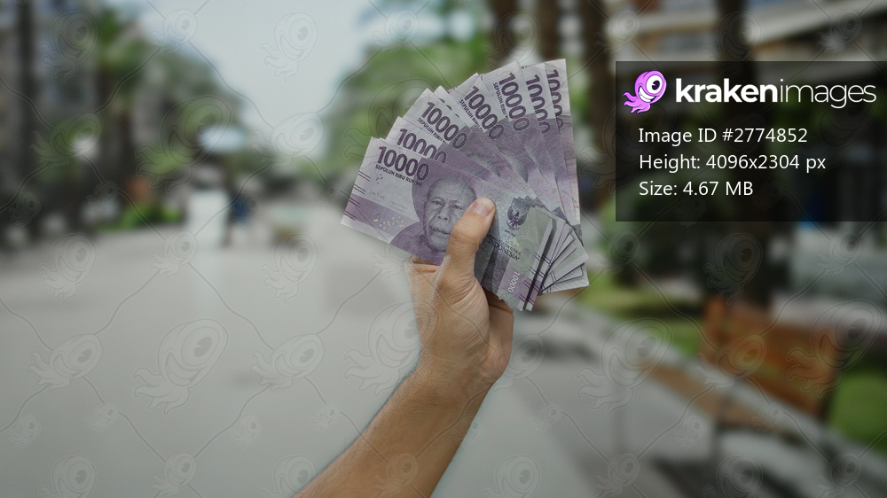 Man holding indonesian rupiah banknotes on a city street showcases finance and economy in an outdoor urban setting.
