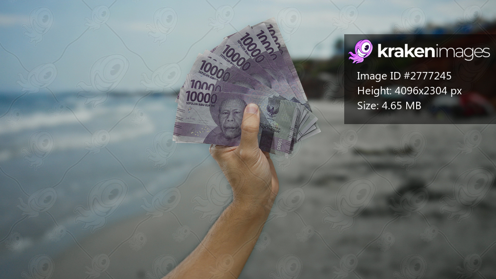 Man holding indonesian rupiah banknotes on a seaside beach setting, showcasing a concept of wealth or travel with currency in a scenic outdoor environment. - Kraken Images
