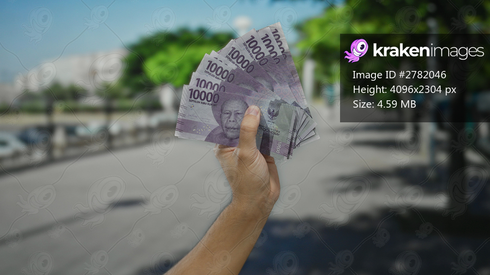 Man holding indonesian rupiah banknotes outdoors on a sunny city street, highlighting financial concept with vibrant natural background, urban environment, and currency details. - Kraken Images