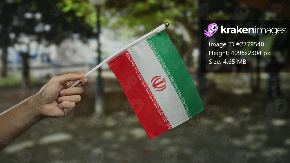 Man holding iranian flag in park setting, symbolizing patriotism in an outdoor environment with green and white colors featured prominently.