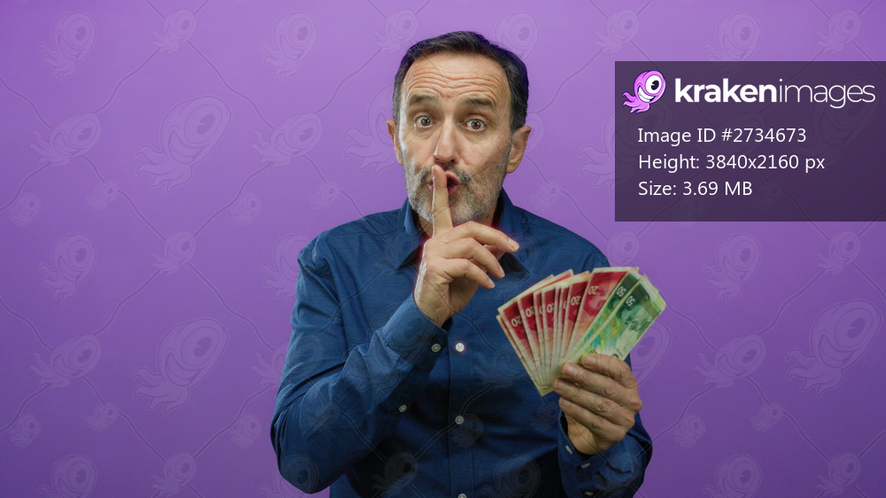 Man holding israeli banknotes against purple background with a secretive expression, conveying financial secrecy and highlighting currency importance in a vibrant setting. - Kraken Images