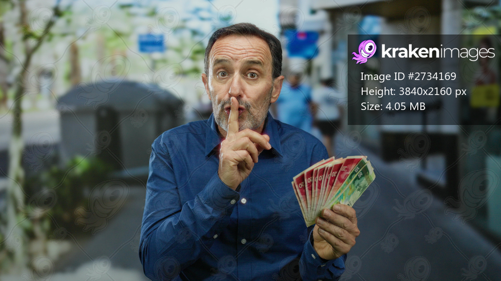 Man holding israeli banknotes quietly in urban park setting with thoughtful expression that implies secrecy or financial planning outdoors in a bustling public space. - Kraken Images