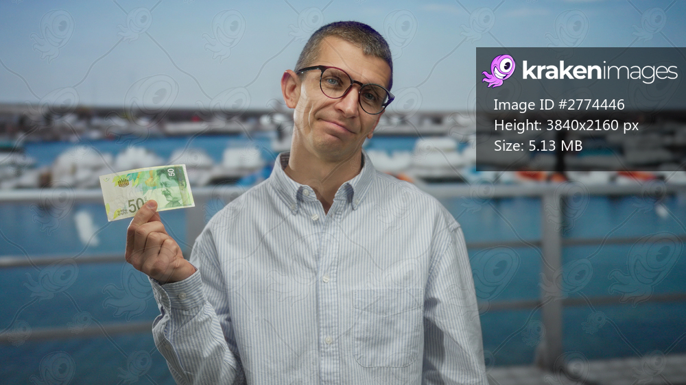 Man holding israeli shekel banknote outdoors by the sea with boats in the background.