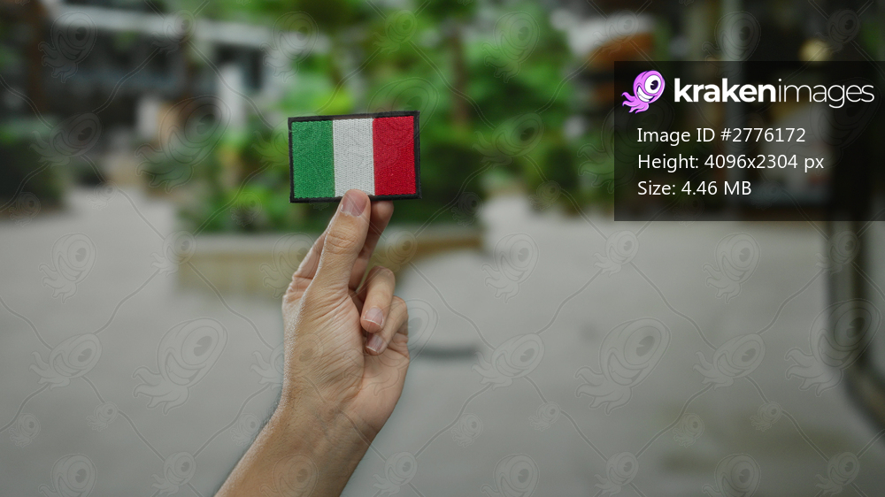 Man holding italian flag embroidery outdoors in a city setting, featuring a clear focus on the hand and flag, symbolizing italian national pride on a vibrant street. - Kraken Images