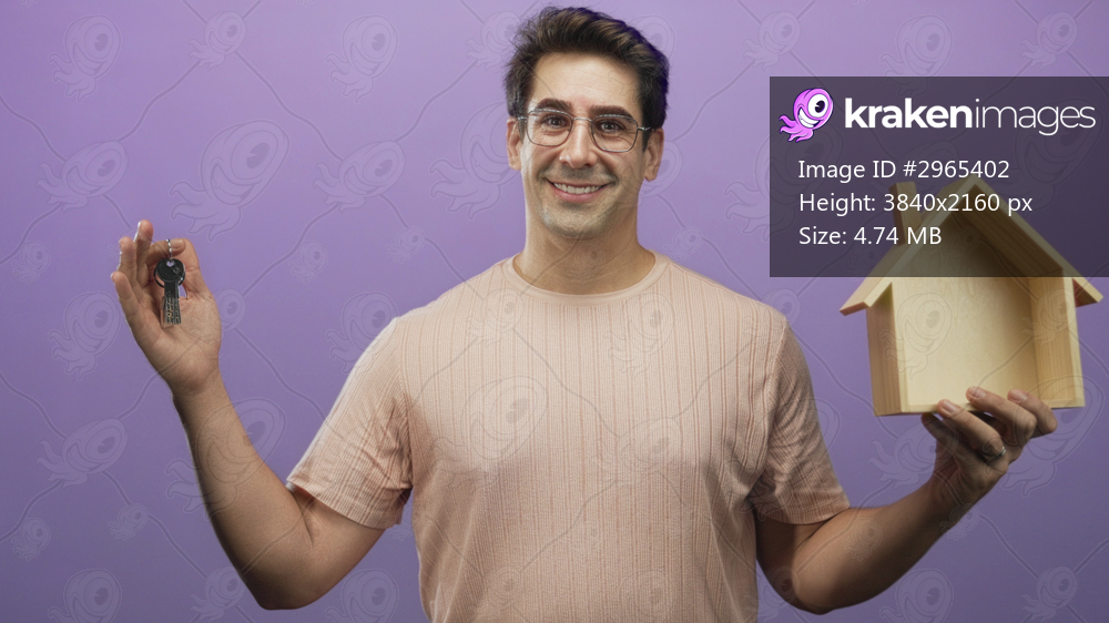 Man holding keys and a wooden house model in studio while smiling and presenting keys; confidence homeownership.