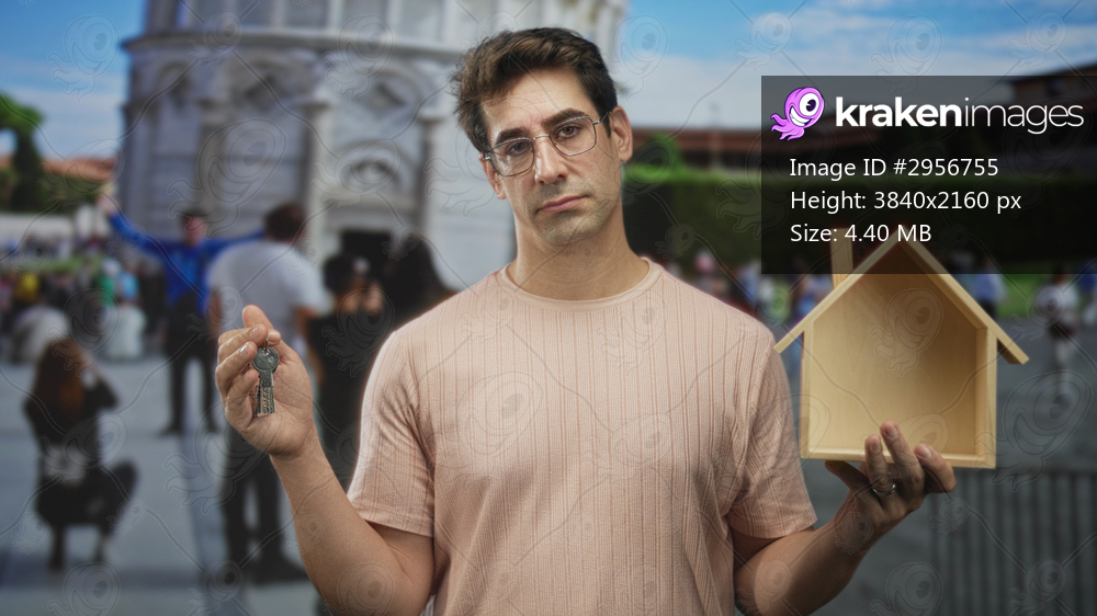 Man holding keys in left hand and a small wooden house model in right hand in front of a historic building, looking uncertain; uncertainty decision.