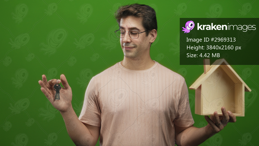 Man holding keys and wooden house model in green studio, smiling and presenting keys with outstretched hand; pride new home.