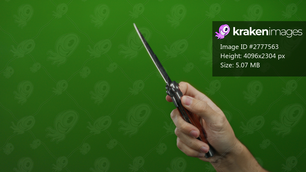 Man holding knife with isolated green background, highlighting the sharp metal blade in a gripping caucasian hand.
