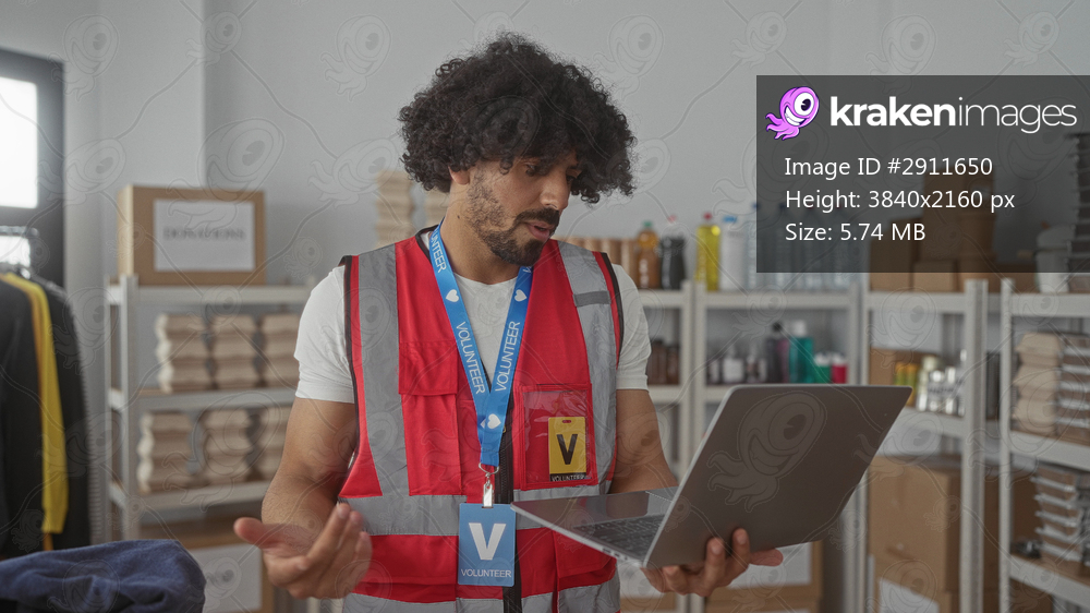 Man holding laptop and gesturing with one hand in building donation center; compassion teamwork support.