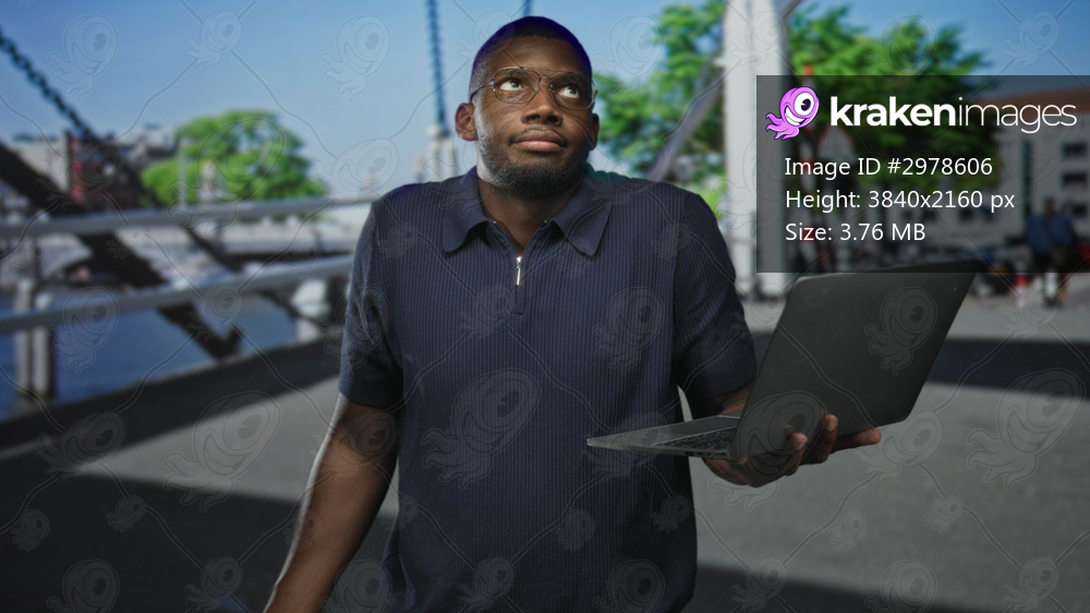 Man holding laptop in one hand and shrugging with other, palm up gesture, wearing glasses on a bridge over canal on a street; confusion remote work.