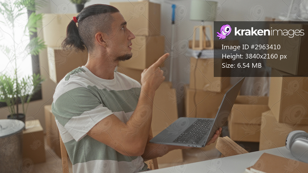 Man holding laptop and pointing finger amid stacked moving boxes in a building living room of a new home; focused planning.