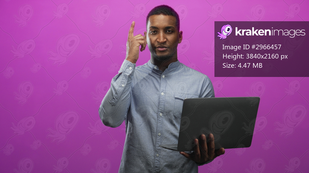 Man holding laptop and pointing finger in studio, wearing blue shirt before purple backdrop; confidence focus.