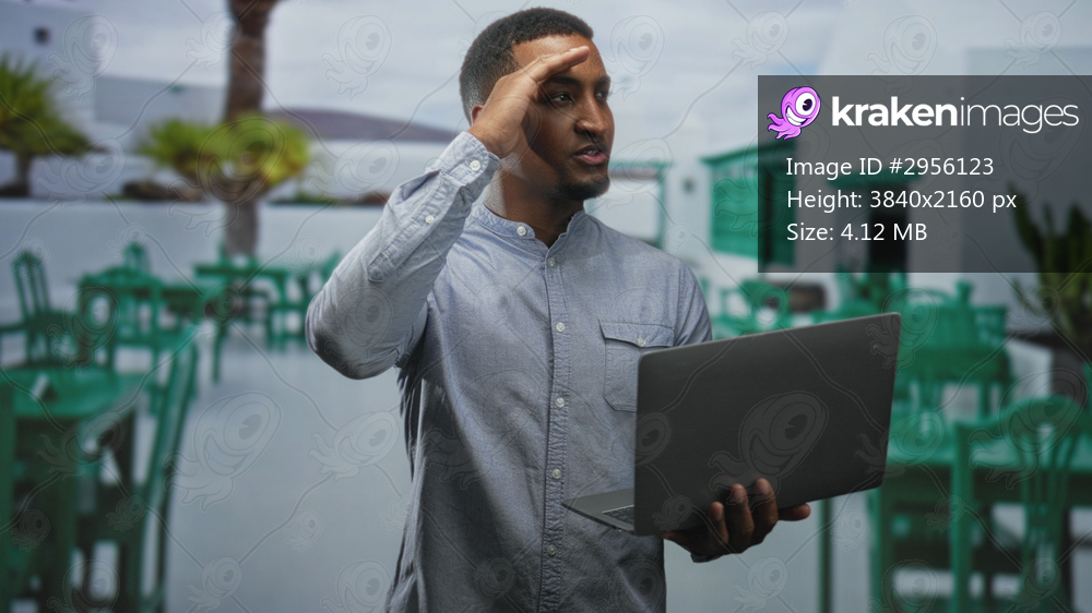 Man holding laptop shading his eyes with hand to forehead in a building courtyard of green chairs and tables; confidence focus.